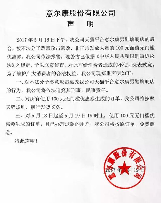 此外,对所有使用100元无门槛优惠券生成的订单,意尔康将按照天猫规则履行发货义务。而对于5月18日起至5月19日19时止,使用100元无门槛优惠券生成的订单但是办理了退款的用户,意尔康将按原订单,免费鞥送。