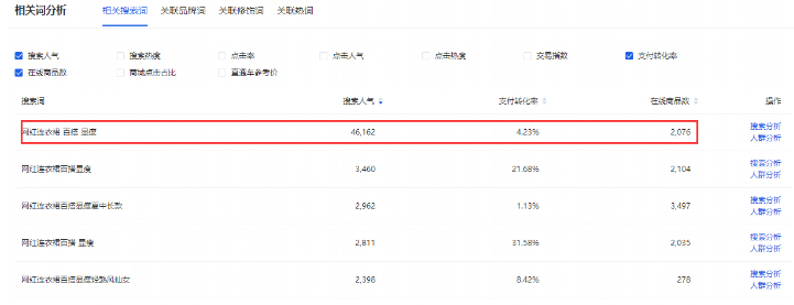 找到核心词之后再去通过我们的属性词找到目标词也就是确定我们要去市场行情找到的我们的目标词,目标词=核心词+1个/多个属性词,比如我们的连衣裙,搜索然后找到会有很多的相关延伸词,这些都称之为目标词,但不是每一个目标词数据都好。因为宝贝在上架之前适合做小词,所以找到的目标词要人气高,竞争小,转化好才适合产品前期的发展,比方说下面这个词【网红连衣裙 百搭 显瘦】