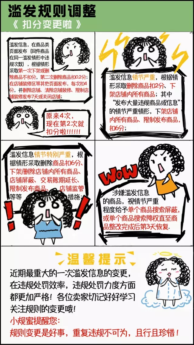 它包括但不限于发布的不是一款实际的商品而是一条心情故事,发布的商品或店铺的基础信息或官方资质信息与实际信息不符、商品发布标题里的信息和商品属性里的不同等等等等等等情形,这些通通属于“滥发信息”的范畴,切记都是不允许的,发现将会被根据情形严重程度各种处罚的!