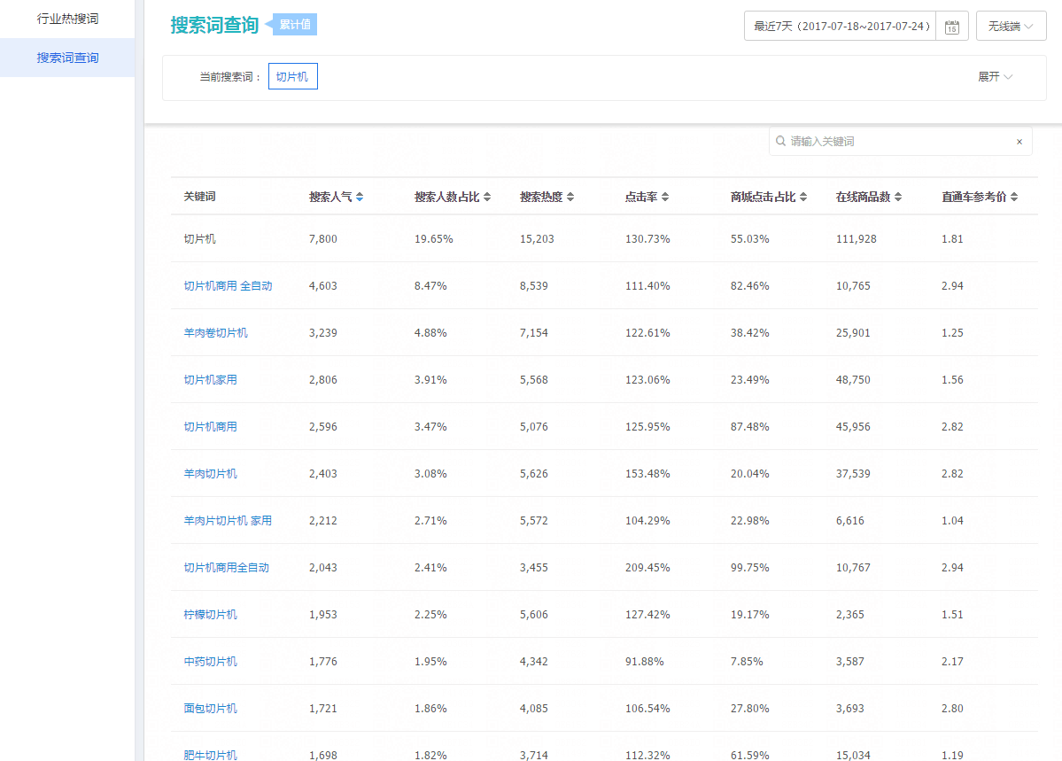 大家在选好产品之后,首先要去做的不是作图、上新,而是去数据分析。最简单的方法要去看两个数据,一是宝贝数、而是搜索指数。今天我们以我们分析出来的切片机举例,看下面数据: