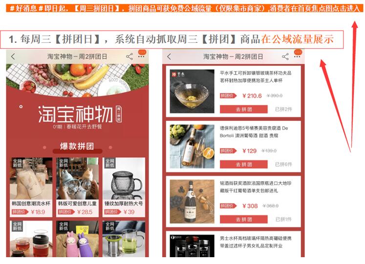 说完了猜你喜欢这里再给大家说一个适合新品做的店内活动,虽然说是店内活动,但是这个活动每周是有计划上淘宝首页的。这个活动就是淘宝的拼团。
